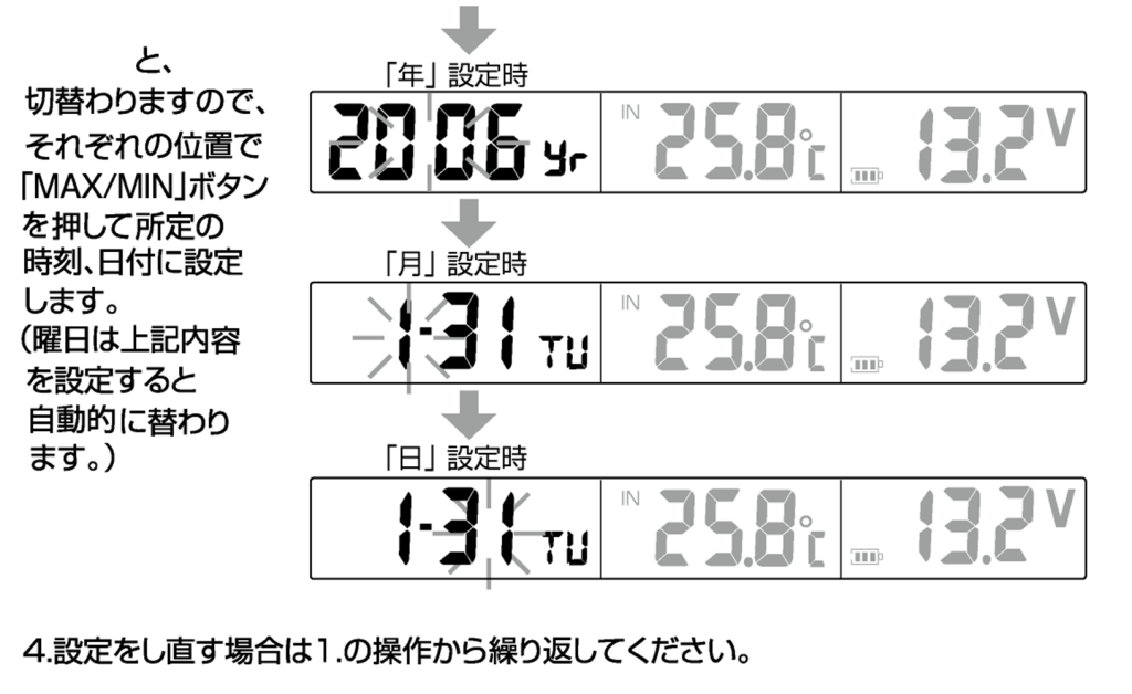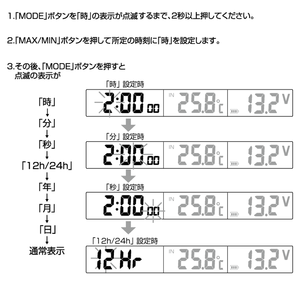 - 「MAX/MIN」ボタンを押して、所定の時刻に「時」を設定します。