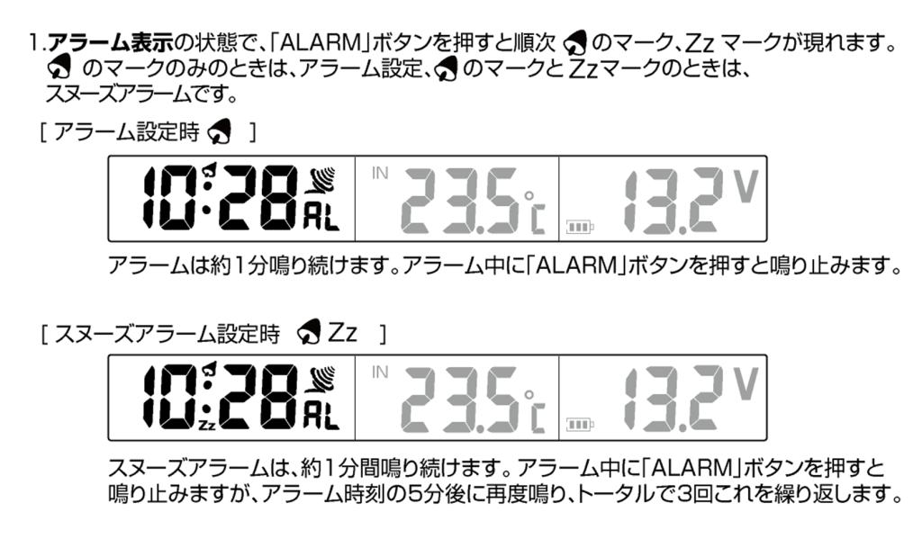 | 8. | アラーム | : | アラーム音持続時間 1分間 スヌーズ時間 5分間(合計3回繰り返し)  |