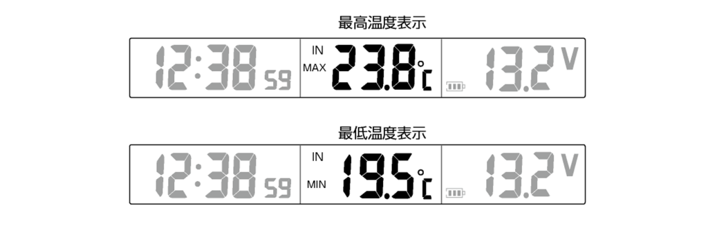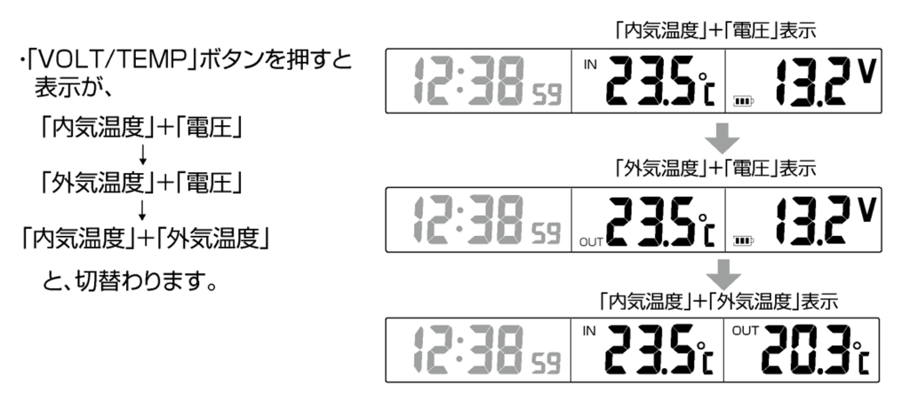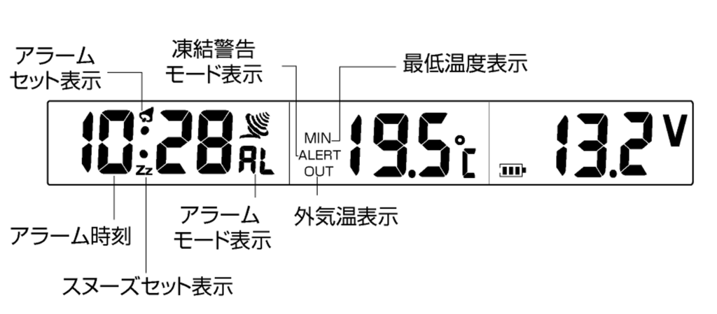 電圧が9.0V以下時に電圧表示が『—V』になります。電圧が9.1~11.5V及び16V以上時、VOLT LED点滅し、警告音が約1分間鳴り続けます。警告音が鳴り終えた後もVOLT LEDは点滅し続けます。又、電圧が9.1~11.5V及び16V以上の状態が続いた場合、約30分後に再度、警告音が鳴り、正常値になるまでこれを繰り返します。
