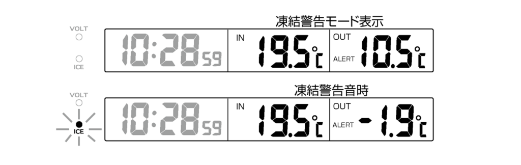 - 警告音が鳴っている時に「ALARM」ボタンを押すと警告音が鳴り止みますが、ICEマークのLEDは外気温度が+4.9℃~−1.9℃の間は点滅し続けます。