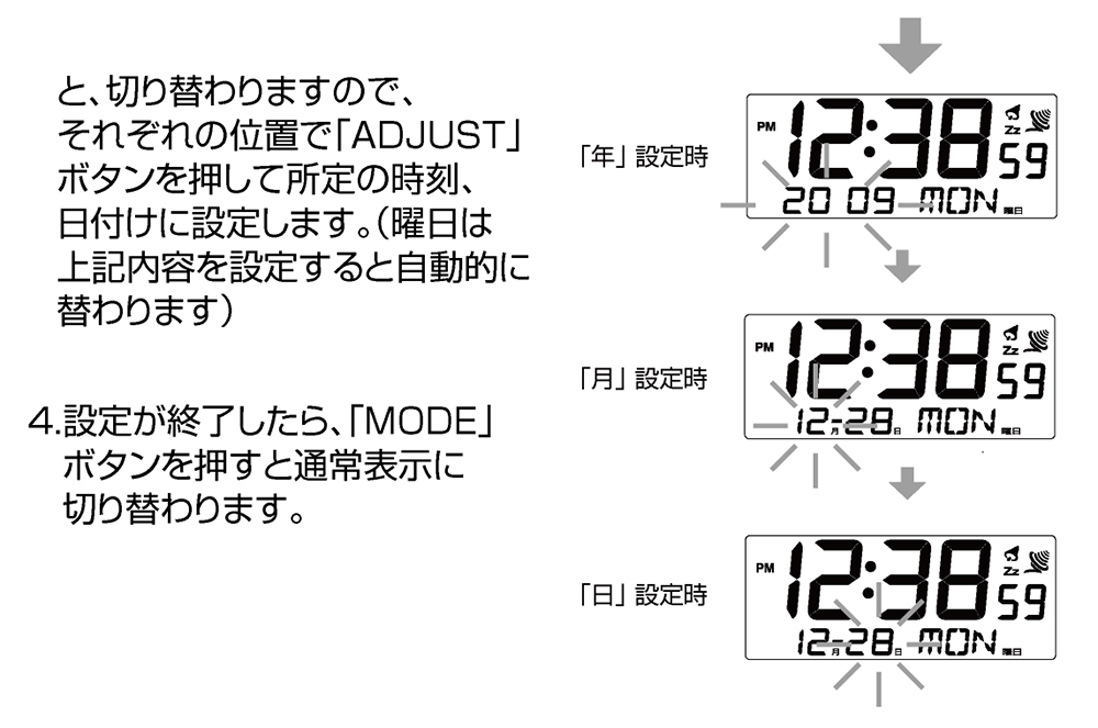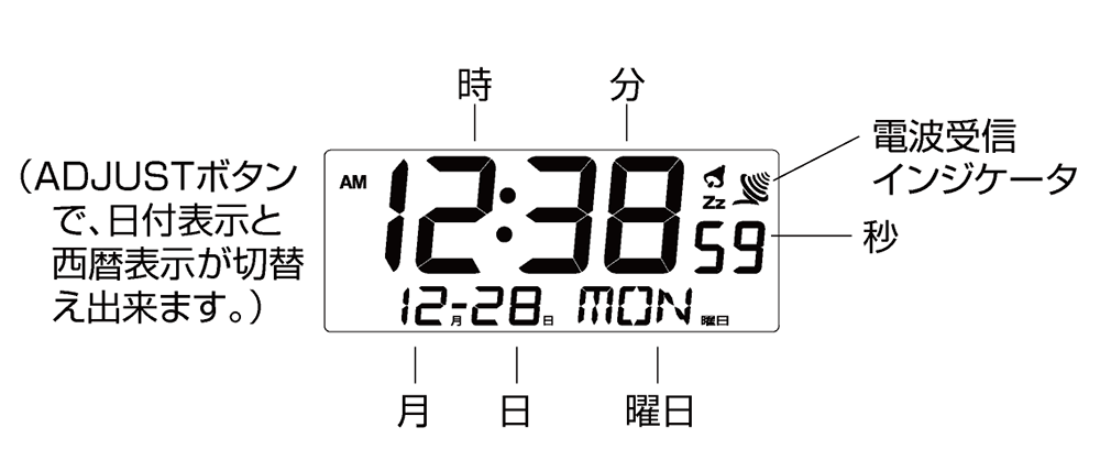 ADJUSTボタンで、日付表示と西暦表示が切替できます。