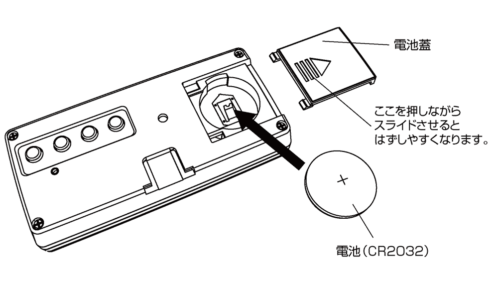 - ボタン電池(CR2032)を図のように+を上にセットして、 電池蓋をもとの位置に戻します。