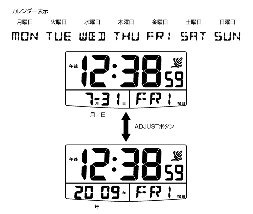 通常時刻表示の状態で、「ADJUST」ボタンを押すと、カレンダー表示が月日/年と切替わります。