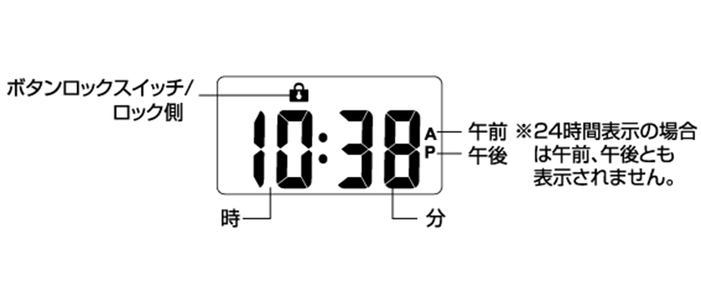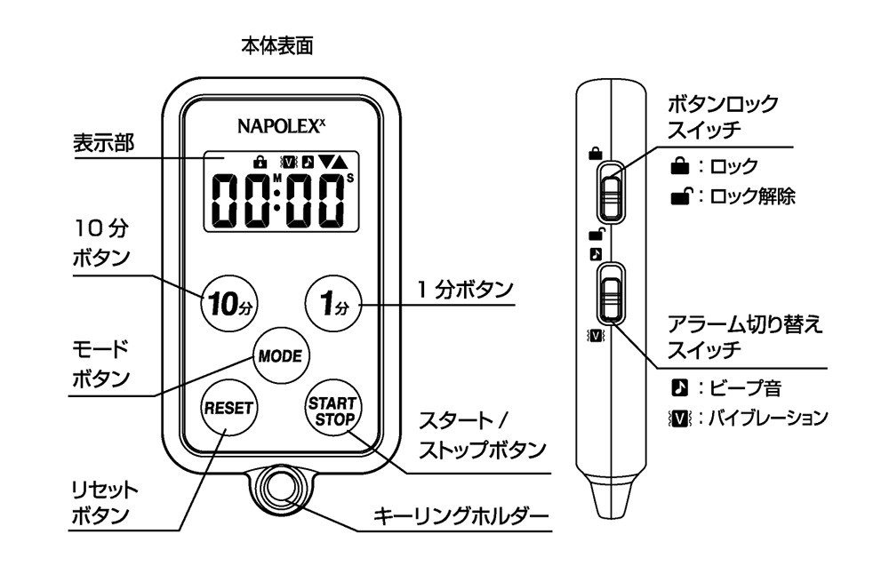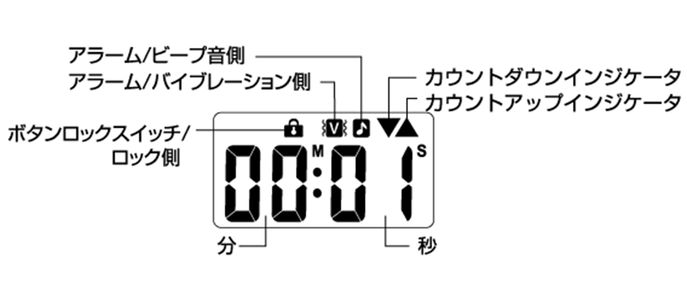 - カウントアップタイマーを停止するには、ボタンロックスイッチがロック解除側になっている場合はどのボタンを操作してもセットしたカウントダウン時間表示に戻ります。アラームがなっている際は、アラームが止まります。