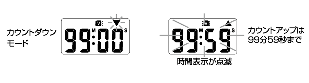 - カウントアップが 99:59になった時、リセットボタンを押すとカウントアップの時間がクリアされます。再度スタート/ストップボタンを押すと 00:00からカウントアップを始めます。
