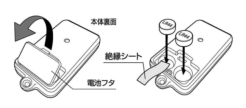 使用開始にまず電池フタを開け、電池ボックスの絶縁シートを抜き取ります。詳しい設定は各設定項目をご覧ください。