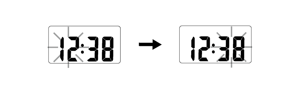 - 時計モード表示の時、リセットボタンを2秒以上長押しすると、時間の表示が点滅を始めます。