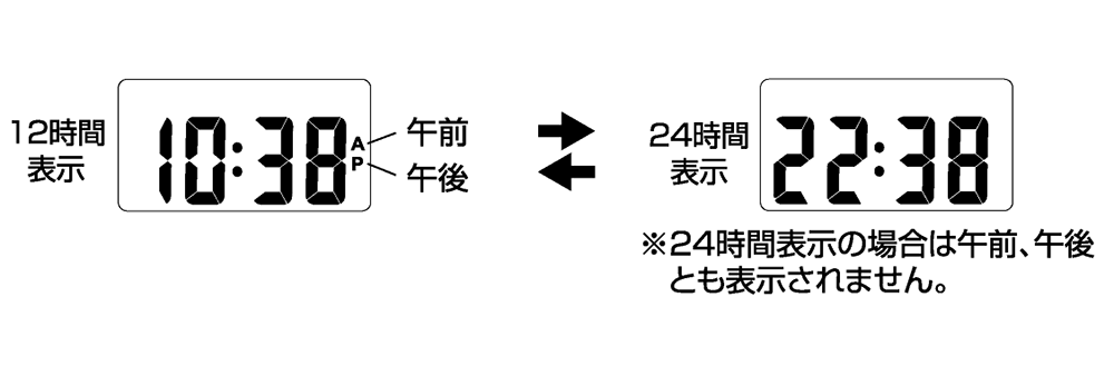 - 時計モード表示の時に、スタート/ストップボタンを押すと12時間表示と24時間表示が切り替えられます。