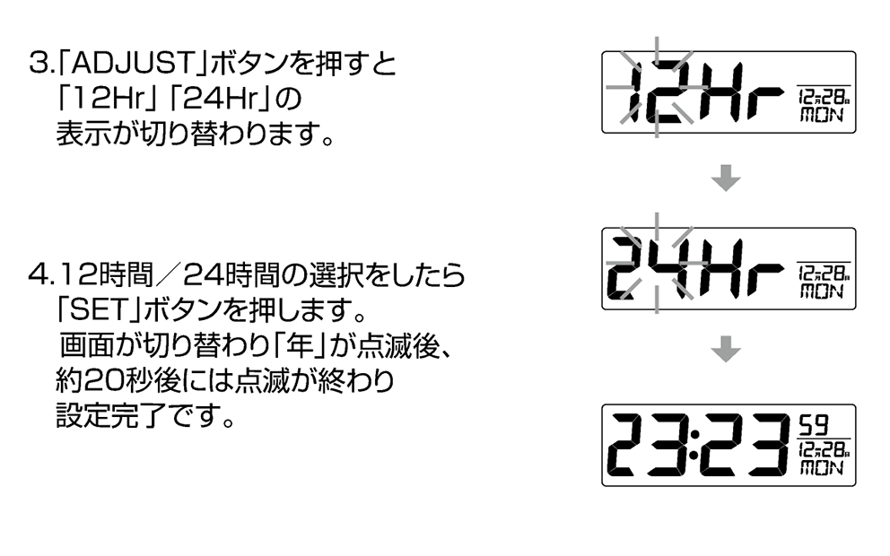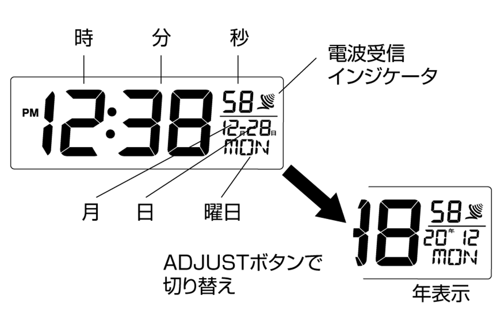 ADJUSTボタンで、日付表示と西暦表示が切替できます。