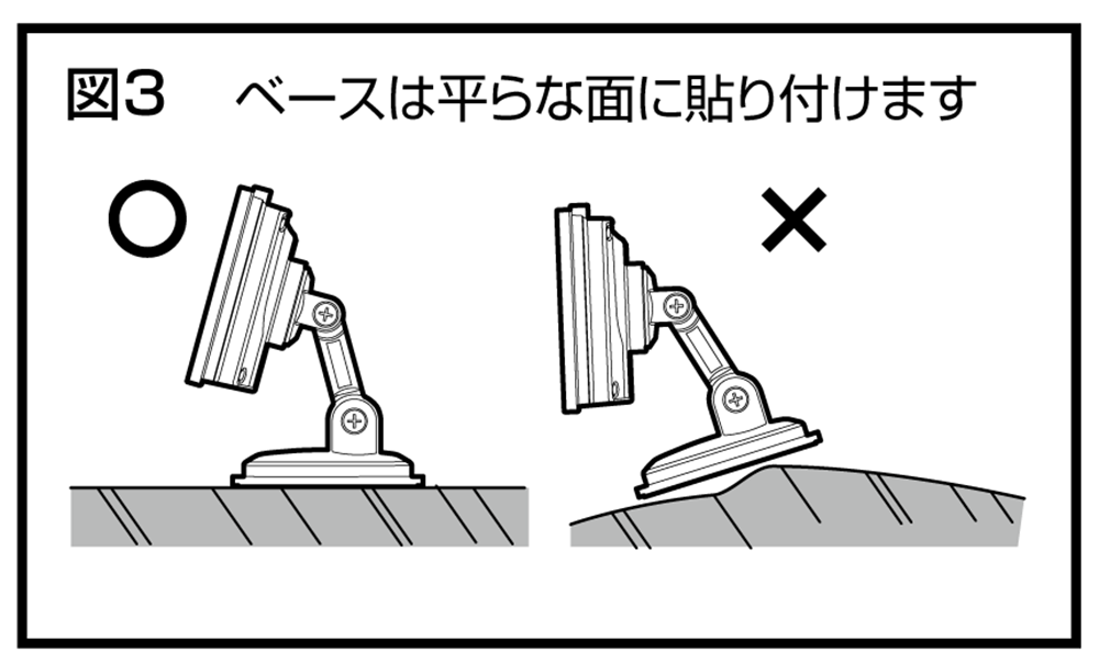 - ベース全体が貼り付く平らな面を選び取り付けてください。曲面や段差に取り付けると本体が外れるおそれがあります。(図3)